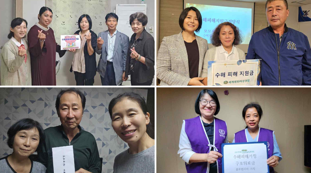 사단법인 세계평화여성연합(이하 여성연합)은 집중호우로 피해를 입은 가정을 돕기 위한 ‘지구가족사랑1%운동 수해피해가정 회복 지원’ 사업을 진행했다. 이번 지원을 통해 대전·충남(7가정), 전북(2가정), 광주·전남·제주(2가정), 경남(5가정) 등 전국 16가정에 총 9,800,000원이 전달되었다.
